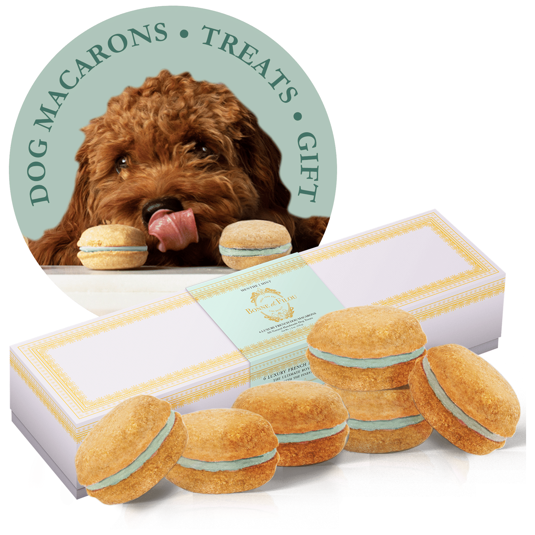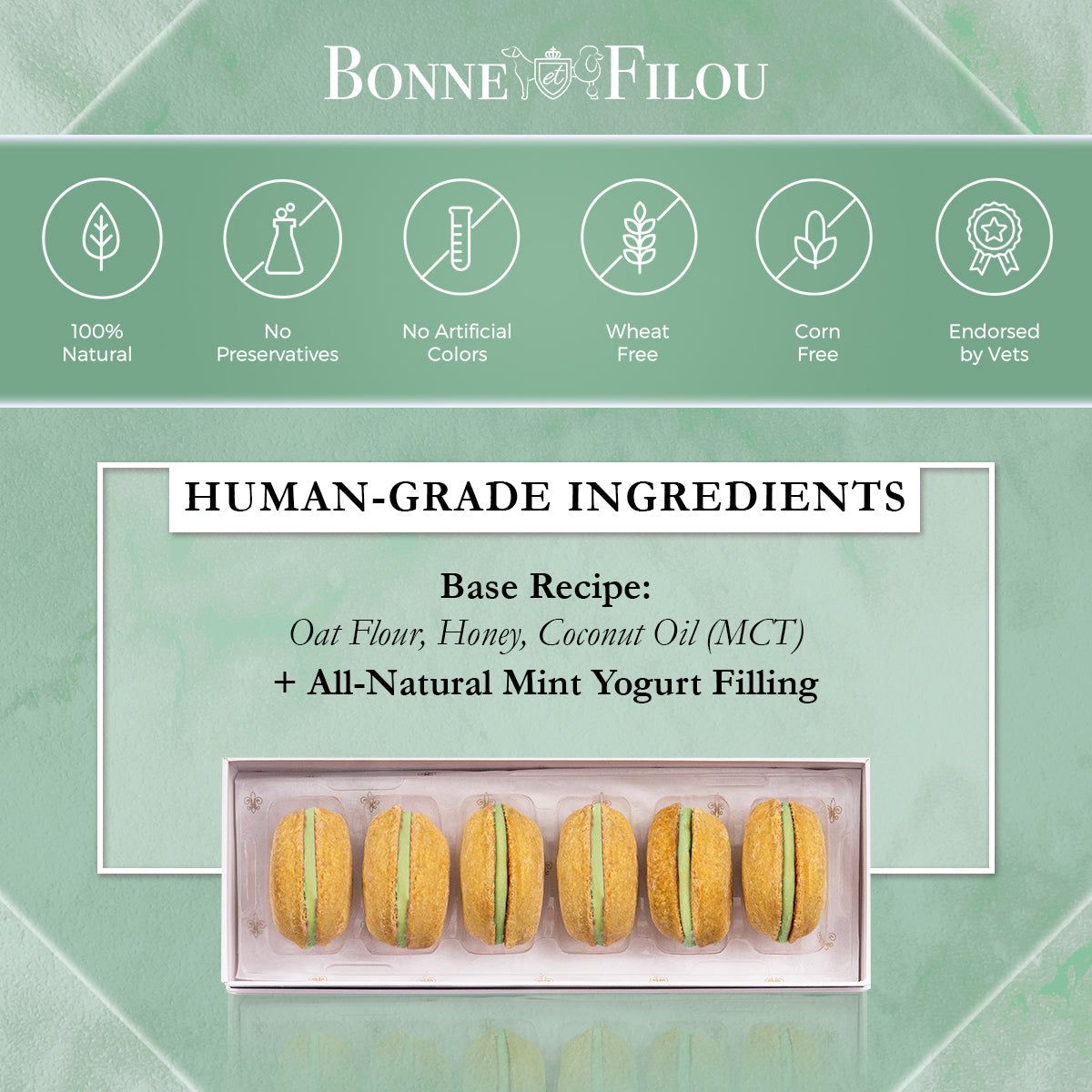 Dog Macarons - Count of 6 (Dog Treats | Dog Gifts)This box of our premium macaron treats features: - Box of 6 dog macarons- Handmade with premium human-grade ingredients in the USA- 100% natural; corn-free; wheat-free ingredients- No artificial coloring or preservatives- Hard treat designed for a long-lasting chew- Shelf life of 12+ months | No need for refrigerationBase Recipe Ingredients: Oat Flour; Honey; Coconut Oil; All-Natural Flavored Yogurt FillingFeeding Instructions:Our treats are hard; designed for a long-lasting chew. For elderly or small dogs; we recommend breaking the treat in smaller pieces (by twisting both sides).