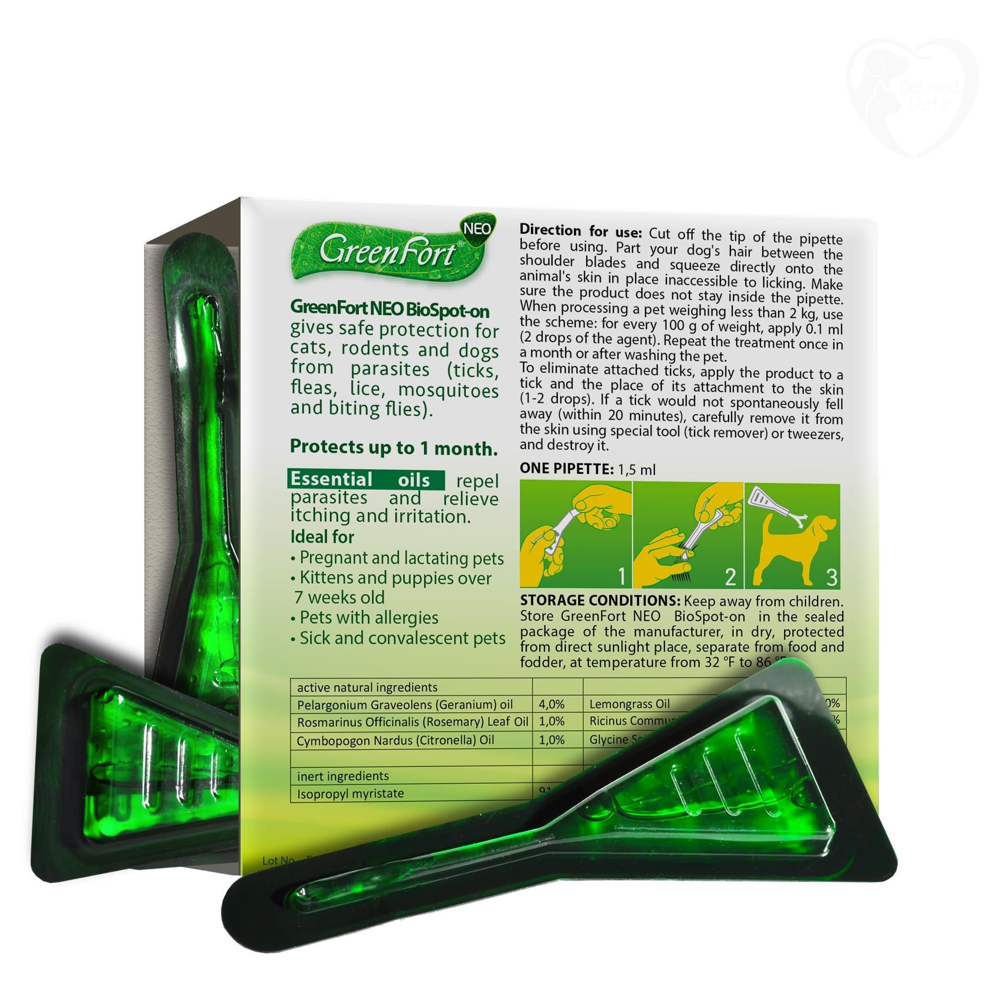 2.absolutely safe and effective protection (made of natural ingredients). this dog and cat flea treatment made with natural essential oils and does not cause harm your pet. 100% natural and organic. greenfort neo bio spot-on is ideal and safe for pregnant pets, kittens and puppies over 7 weeks old, pets with allergies and sick pets. the flea control you can trust.
