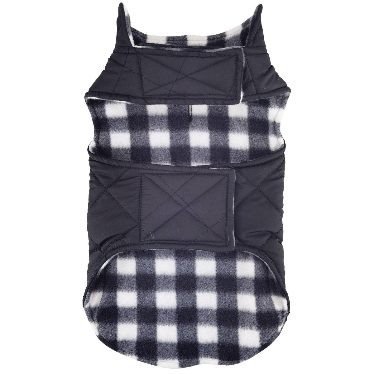 Reversible Fleece Lined Puffer Dog Coat in pink and black plaid is easy on and easy off. This stylish and warm blanket coat features a solid color puffer material on one side and a soft fleece lining on the other.  Available with an adjustable hook and loop closure fit at the neck and belly, and leash access. Available in sizes XS to 3XL.